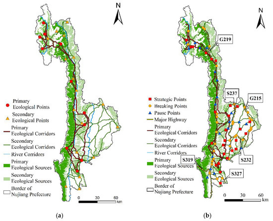 - By constructing the ecological security pattern in Nujiang Prefecture, the total areas of primary and secondary ecological sources were 3281.35 km2 and 4224.64 km2, accounting for 22.32% and 28.73% of the total area of the prefecture, respectively. The spatial distribution of the primary and secondary ecological sources was found to be uneven and primarily distributed in nature reserves and natural scenic spots. The study identified 11 primary ecological points, 17 secondary ecological points, and 26 ecological corridors with a total length of 755.40 km, and 39 secondary ecological corridors with a total length of 929.26 km. The study additionally identified three river corridors with a total length of 550.472 km, and 82 ecological nodes comprising 26 strategic points, 36 breaking points, and 20 pose points.