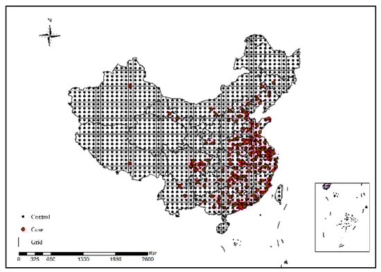 As shown in Figure 1, sample collection rules adopted in this study were as follows: (1) a total of 1474 H7N9 human cases in China were collected from 2013 to 2017, (including 155 cases in 2013, 326 cases in 2014, 196 cases in 2015, 243 cases in 2016, and 554 cases in 2017); ②a map of China (1: 4,000,000) was regularly divided into 100 km × 100 km grids, and the center of gravity of the grids was extracted. Each grid center of gravity that did not coincide with any case point was used as a control sample [], and a total of 223 control sample points were obtained.