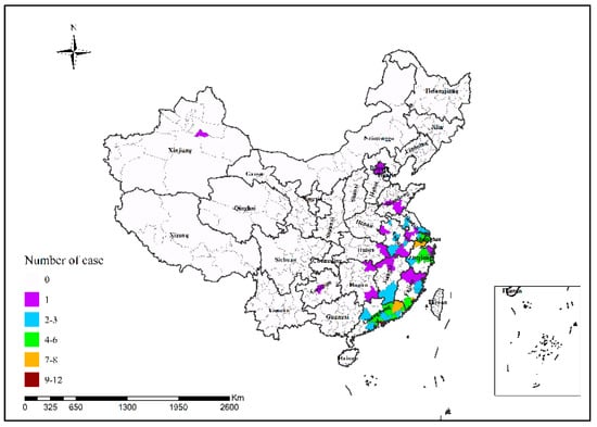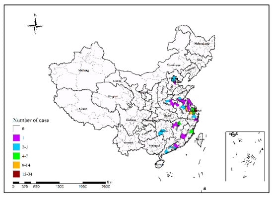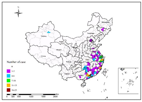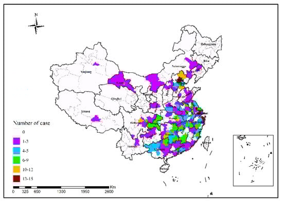The first avian influenza A(H7N9) human case was found in China in early 2013, followed by the discovery of the virus in local live poultry markets []. Since then, avian influenza A (H7N9) outbreaks in humans (abbreviated to H7N9 outbreaks in this study) became a very important issue during H7N9 epidemics for Chinese health []. The avian influenza A (H7N9) virus is a form of influenza A caused by the H7N9 bird flu virus []. The body temperatures of most H7N9 human cases are above 38.5 ℃, and symptoms such as cough and expectoration may develop into severe pneumonia and death within one week []. In 2017, a mutant strain was considered to be highly pathogenic to birds and could lead to multiple H7N9 outbreaks in China []. Since the first H7N9 human case emerged in early 2013, there have been six H7N9 outbreaks in 29 provinces and cities in China, infecting about 1600 people []. H7N9 outbreaks have posed great challenges to public health and social and economic stability in China, and the study on the spatial and temporal distribution and the outbreak risk simulation of H7N9 human infections has become a research hotspot in the public health field in recent years.