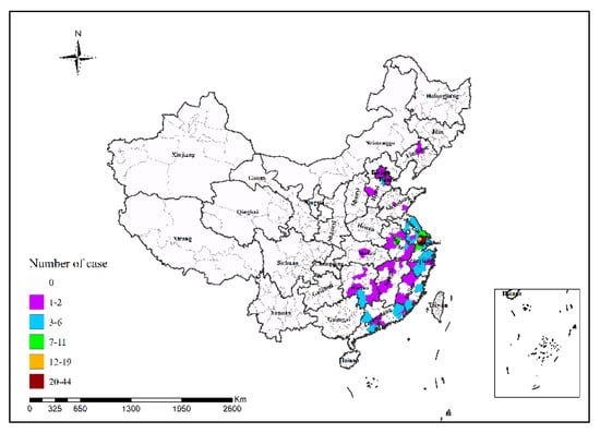 In 2017 Chen et al. believed that the high pathogenicity and the rapid development of the H7N9 virus might be caused by frequent gene recombination and easy mutation in the breeding process []. In order to address the severe challenges posed by H7N9 outbreaks, a large number of experiments and vaccine studies were carried out in 2015 and 2016. In the fifth H7N9 outbreaks in humans in China, the number of people infected with H7N9 virus was increasing continuously, which attracted extensive attention from the public and public health departments []. In order to control H7N9 outbreaks, many areas along the southeast coast of China (such as Shanghai), gradually closed all live poultry markets after 4 April 2013 []. At present, studies have found that outbreaks and transmission of H7N9 outbreaks are liable to be related to poultry trade, vegetation cover, population density, temperature, rainfall and humidity []. Since 2013, H7N9 outbreaks in the Yangtze River Delta region and eastern China have been reported repeatedly [,]. Studies showed that as one of the three major migratory bird routes through China, the risk of transmission of H7N9 outbreaks in eastern China, including the Yangtze River Delta and Pearl River Delta, was particularly high [,]. In addition, the spatial distribution of H7N9 human cases in China showed that the density of H7N9 human cases was the highest from the vicinity of the Yangtze River Delta to the south of the pearl River Delta, forming a large space-time aggregation area [].