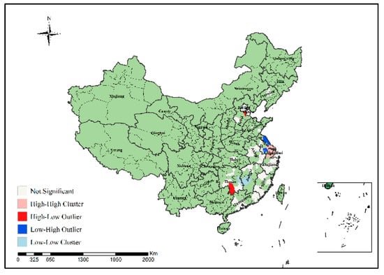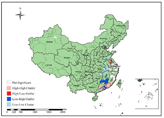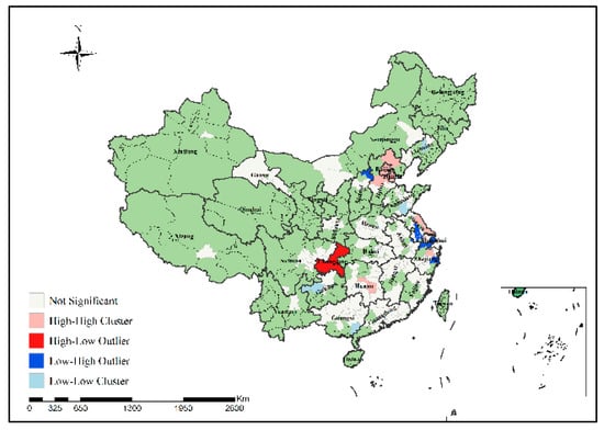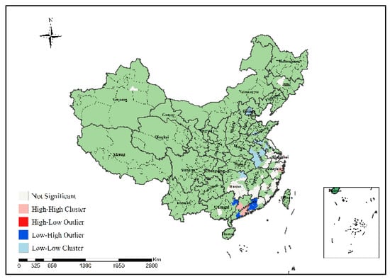 Local spatial autocorrelation analysis results of H7N9 outbreaks in China in 2016.