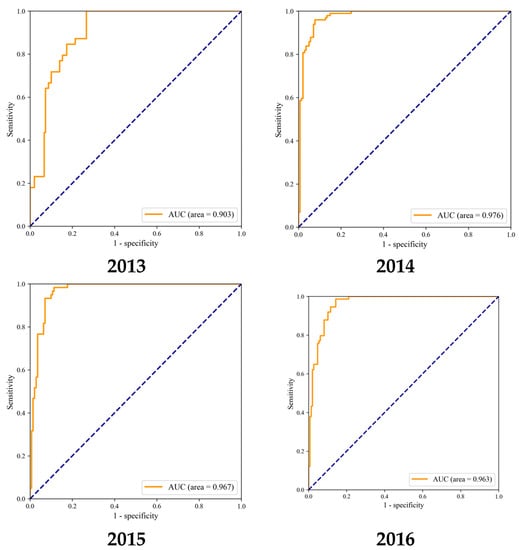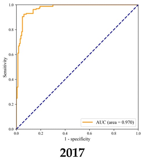 In this study, the assessment of consistency rate and AUC (area under the ROC curve, as shown in Figure 12) were used to evaluate indicators of the neural network risk simulation model of H7N9 outbreaks in China. This risk simulation model was established based on the neural network algorithm in the epidemic training set samples, and the risk simulation was conducted on the epidemic test set from 2013 to 2017. The simulation accuracy of the neural network risk simulation model of H7N9 outbreaks in China from 2013 to 2017 were 85.71%, 91.25%, 91.54%, 90.49% and 92.74, respectively, and the AUC were 0.903, 0.976, 0.967, 0.963 and 0.970, respectively, the results show that the model constructed in this paper has relatively good accuracy, as shown in Table 3.
