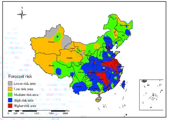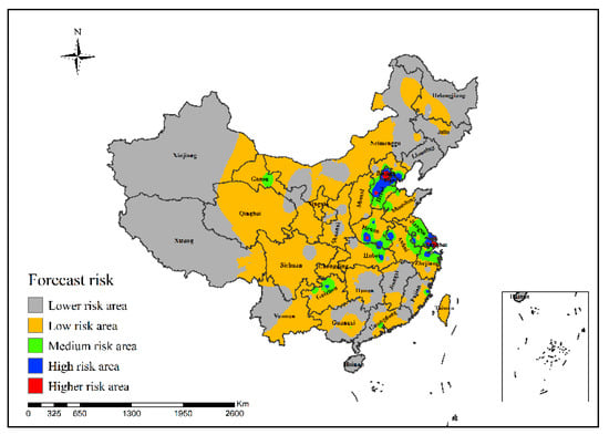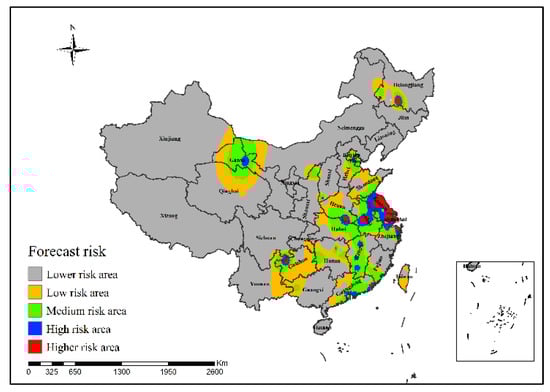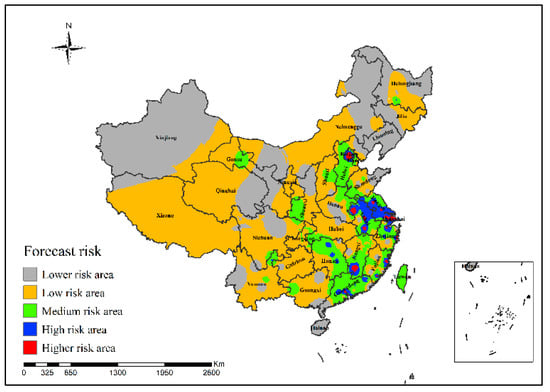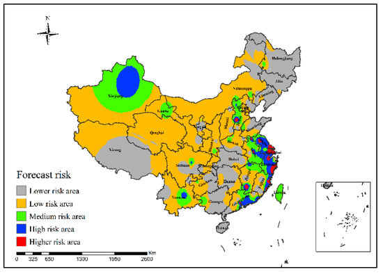 It can be concluded from Figure 14 that in the epidemic risk map generated by the neural network risk simulation model of H7N9 outbreaks in China in 2014, the simulated areas with high risk of H7N9 outbreaks were mainly concentrated in Beijing, Jiangsu, Zhejiang, Fujian and Guangdong provinces.