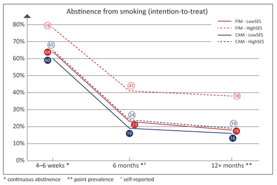 Successful quitting based on a complete case approach can be seen in Appendix B. The highest crude abstinence rates were seen among participants with high SES in the FIMs.