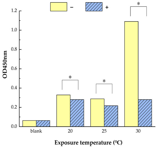 Diminished allergenicity of allergen Der f 2 was analyzed by ELISA. Der f 2 (250 ng/mL, 250 ng/mL and 2000 ng/mL, at 20 °C, 25 °C, and 30 °C, separately) were treated with and without todomatsu oil (0.05 µL/cm3) for 1 h. The results represent the mean of three independent replicates. −/+: Samples of Der f 2 without/with todomatsu oil. * indicates a significant difference (p < 0.05).