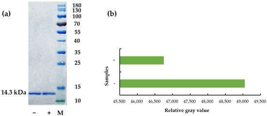 Decreased content of Der f 2 treatment with todomatsu oil was examined via SDS-PAGE. (a) analysis of allergen content by SDS-PAGE; (b) quantification of results from SDS-PAGE. Der f 2 (100 µg/mL) was treated with and without todomatsu oil (0.05 µL/cm3) at 25 °C for 2 h. −/+: Samples of Der f 2 without/with todomatsu oil; M: marker.