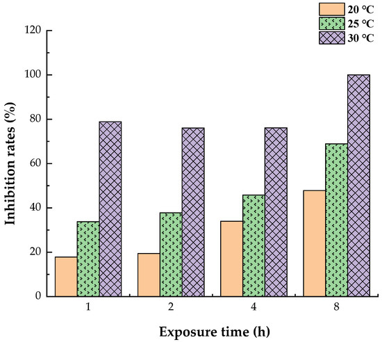 Furthermore, the inhibition rates of allergen Der f 2 by todomatsu oil were estimated. As shown in Figure 4, the inhibition rates are 17.81%, 19.41%, 33.97%, and 47.85% at 20 °C for 1, 2, 4, and 8 h; 33.78%, 37.78%, 45.82%, and 68.89% at 25 °C for 1, 2, 4 and 8 h; 78.86%, 76.05%, 76.14% and 100.0% at 30 °C for 1, 2, 4 and 8 h, respectively. The maximum inhibition (100.0%) was discovered at 30 °C after 8 h. Additionally, it appears the inhibition rates of todomatsu oil on Der f 2 rises with increased exposure temperature. The increased concentration of evaporated todomatsu oil with increased exposure temperature may contribute to that.