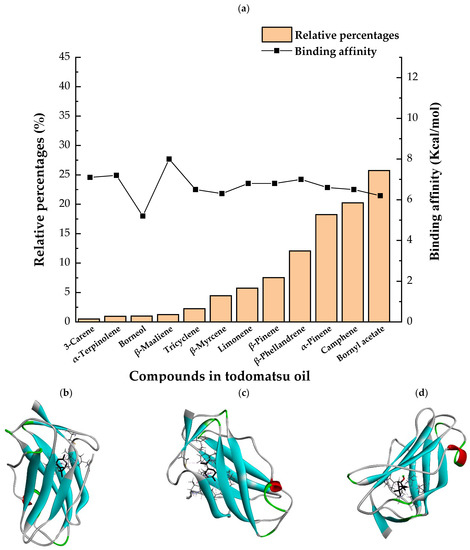 In the report from Tatsuro et al. (2010), bornyl acetate, camphene, α-pinene and β-phellandrene are the dominant compounds with the highest relative percentages in todomatsu oil (shown in Figure 5a) [37], β-pinene, limonene, and β-myrcene are followed [37], while tricyclene, β-maaliene, borneol, α-terpinolene, and 3-carene are the compounds with the lowest relative percentages (less than 3%) in todomatsu oil [37]. These compounds are bound to allergen Der f 2 by alkyl hydrophobic interactions, and their binding affinities on the Der f 2 are shown in Figure 5a and Table 3. The binding affinities display the abilities of a compound to connect to the target [40,41]. The binding affinity values of bornyl acetate, camphene, α-pinene, and β-phellandrene on allergen Der f 2 are −6.2 kcal/mol, −6.5 kcal/mol, −6.6 kcal/mol, and −7.0 kcal/mol, respectively (shown in Figure 5a and Table 3i–l). Interestingly, compounds with the lowest relative percentages in todomatsu oil show high-affinity values on Der f 2 instead. As shown in Figure 5a and Table 3a–b,d, the binding affinity value of β-maaliene (−8.0 kcal/mol) on Der f 2 is the highest, followed by α-terpinolene (−7.2 kcal/mol) and 3-carene (−7.1 kcal/mol).