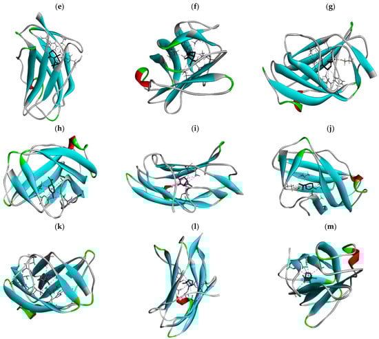 The binding sites and affinities of compounds in todomatsu oil (including 3-carene, α-terpinolene, borneol, β-maaliene, tricyclene, β-myrcene, limonene, β-pinene, β-phellandrene, α-pinene, camphene, and bornyl acetate) on allergen Der f 2 were investigated in silico by molecular docking. The compounds in todomatsu oil have been discovered to bind to allergen Der f 2 via alkyl hydrophobic interactions. Hydrophobic interactions are significant for the folding of proteins correctly, as well as also crucial in keeping a protein stable and biologically active because they enable the protein to have less surface area and fewer unfavorable interactions with water. The binding positions of the compounds on Der f 2 are shown in Figure 5b–m, and the interactions of these compounds with the amino acid residues on the Der f 2 are shown in Table 3.