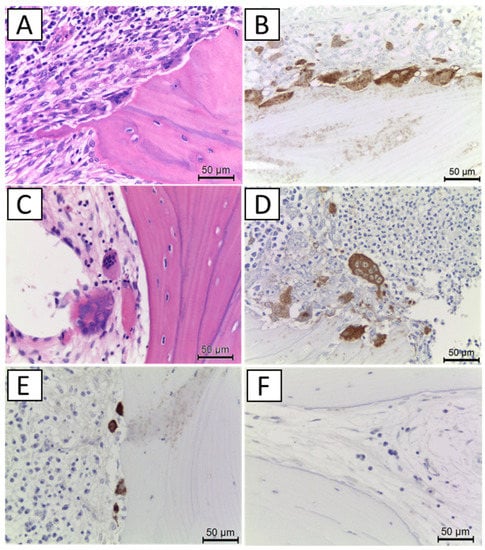 Histopathology sections were decalcified in 0.5 M ethylenediaminetetraacetic acid solution with gentle agitation at 4 °C, postfixed in a fixing solution, dehydrated, and embedded in paraffin to prepare 4-μm-thick sections. Antigen activation in immunostaining was performed in Dako Target Retrieval Solution (DAKO, Carpinteria, CA, USA) using the warm bath method at 80 °C for 15 min. The primary antibody was rabbit anti-cathepsin K polyclonal antibody (1:2000, Abcum: ab19027) and incubated at 4 °C overnight. Secondary antibodies were EnVision+ System- HRP Labelled Polymer Anti-Rabbit (DAKO). For immunohistochemical reactions, Liquid DAB+ Substrate Chromogen System (DAKO) was used according to the manufacturer’s protocol. Mayer’s hematoxylin was used for nuclear staining.
