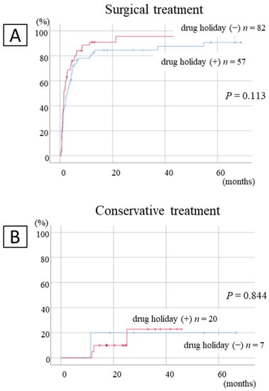 The cumulative cure rate with and without drug suspension was obtained using the Kaplan-Meier method and tested by the log-rank test, divided into surgical cases and preserved cases. Furthermore, each variable examined was analyzed for association with healing rates using a univariate Cox regression analysis, followed by a multiple Cox proportional hazard model including variables with p-values smaller than 0.1 in the univariate analysis and the drug holidays longer than 3 months as covariates. The relationship between AR drug holidays and the healing rate was determined using the Kaplan-Meier method, separately for conservative and surgical therapy cases. All statistical analyses were performed using SPSS software (version 26.0; Japan IBM Co., Ltd., Tokyo, Japan), and a 2-tailed p-value of <0.05 was considered significant.