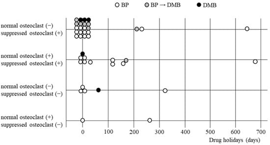 23]. Since we wanted to investigate the difference between the period of drug holiday osteoclast inhibition in both drugs, we registered both BP and DMB cases as target cases this time. Although the number of DMB cases was small and a clear conclusion could not be drawn, we were able to suggest that osteoclasts do not recover even in DMB cases after several months of withdrawal.