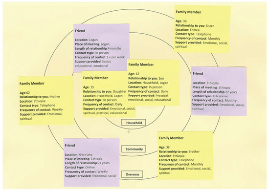 e. Sociogram: Participants used a visual mapping of social connections exercise to create a sociogram that identified people within their respective networks and summarized details about the nature of their relationships. Yellow post-it notes identified people who were family members, while purple post-it notes identified friends. The post-it notes were categorized according to connections in ‘household’, ‘community’ or ‘overseas’. Figure 1 provides an example of a typical, de-identified sociogram based on a participant’s description of their social arrangements. All sociograms were documented using the same format. This example sociogram has 8 people listed as providing social support.