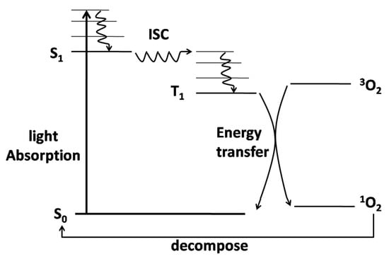 Self-sensitized photolysis by the photosensitized excitation of oxygen in its ground triplet state (3O2) to its lowest singlet excited state (1O2) (S0: photosensitizer ground state; S1: singlet excited state; ISC: intersystem crossing; T1: triplet state). Reproduced with permission from Martin et al., J. Photochem. Photobiol. [63]; published by Elsevier, 2017.
