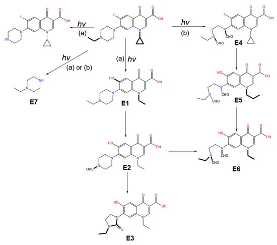 Photolysis is an important contributor to antibiotic degradation in the environment [67]. Whether photolysis can occur depends largely on the chemical structure of the pollutant. Photolysis occurs mainly in the water and soil, and many environmental factors, including light intensity, environmental pH, catalysts, and metal ions, significantly impact antibiotic photolysis. Most current studies on photolysis focus on the reaction conditions, reaction rates, reaction substances, and their products involved in photolysis. For example, pH has a significant effect on the degradation of tetracycline since alkaline conditions are more favorable to photolysis and the rate of the reaction increases as the pH rises [65]. Different degradation pathways with different products are activated as the pH changes, illustrated by the photolytic degradation of enrofloxacin under different pH conditions [68] in Figure 3. Under ultraviolet irradiation at pH4, the F atoms of enrofloxacin are replaced by hydroxyl group (E1), and the piperazine side chain is oxidatively rearranged (E2 and E3). However, at pH8, the ethylpiperazine ring is oxidatively ruptured (E4), the F atoms are replaced, and the cyclopropane ring is oxidatively ruptured (E5 and E6). Batista et al. found that in the absence of Fe3+, the photolysis rates of sulfonazine and sulfonthiazole in the aquatic environment were only one-third of the rates in the presence of Fe3+ [69]. Iron can exist in the Fe(OH)2+ form in aqueous solution, and is converted to Fe3+ through a series of reactions under light with the production of ∙OH and HO2∙, thus promoting antibiotic photolysis as represented in the following reactions in Equations (1)–(5):