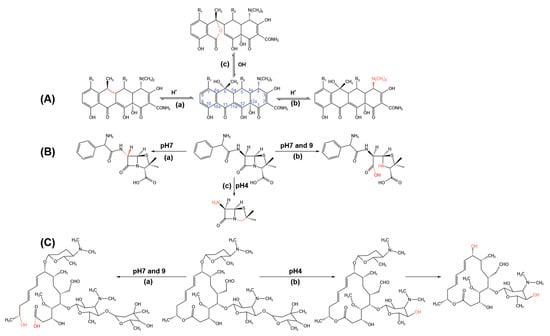 Most antibiotics that can be hydrolyzed are water-soluble and the degree of hydrolysis is dependent on the specific characteristics of antibiotics [70]. Tetracycline, β-lactams, and macrolides are relatively easily hydrolyzed [71,72,73,74,75] while quinolones and sulfonamides are not [76,77]. In acidic conditions, the hydrolysis of tetracyclic antibiotics mainly proceeds though two different reactions [72,73]. One is the dehydration reaction between hydroxy group at C-6 and hydrogen on C-5 (Figure 4A(a)), and the other is the epimerization reaction of dimethylamine group at C-4 (Figure 4A(b)). While under alkaline conditions, the ring of tetracycline is opened to form lactone isomer owing to the nucleophilic attack of OH– on C-11 (Figure 4A(c)) [72,73]. The hydrolysis process of β-lactam antibiotics is the break of amide bonds (ampicillin as an example, Figure 4B(c)) or the open of quaternary ring (Figure 4B(b)) [74]. For macrolide antibiotics, the glycosidic bonds among sugars break in acidic conditions, so do the glycosidic bonds between sugars and macrolide ring (spiramycin as an example, Figure 4C(b)), and in alkaline conditions the ester bonds in lactone ring hydrate, which can open the macrolide ring (Figure 4C(a)) [75].