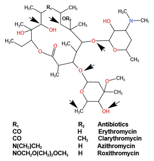 The possible attack site of ∙OH against several macrolides. Reproduced with permission from Babic et al., Curr. Opin. Green Sust. [121]; published by Elsevier, 2017.