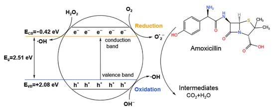 Many AOPs are based on a combination of strong oxidants (e.g., ozone, hydrogen peroxide, sulfate radicals (SO4−)), with catalysts (e.g., photocatalysts like perovskite), or radiation (e.g., ultraviolet or ultrasound). Suwannaruang et al. [123] used CexSr1−xFexTi1−xO3 perovskite catalysts for the enhancement of β-lactam antibiotics photodegradation under visible light irradiation. A diagram illustrating the degradation mechanism of the Ce0.04Sr0.96Fe0.04Ti0.96O3 photocatalyst as an example is provided in Figure 6. When the catalyst is irradiated with visible light, electron and hole pairs are formed in the materials. The holes in valence band of semiconductor can induce an oxidation reaction at +2.08 eV, while the electrons in conduction band of the materials are used for the reduction reaction at −0.42 eV. Superoxide anion radicals (O2•–) and H2O2 can be produced by the reaction of the adsorbed O2 with the photogenerated electrons on the conduction band. In addition, active OH• can be formed by subsequent reaction of the generated H2O2 with the photogenerated electrons, and OH• can be produced in the photogenerated holes on the valence band. Thus, the generated active OH• and O2•– radicals can degrade the antibiotic amoxicillin into small structural intermediates or harmless products.