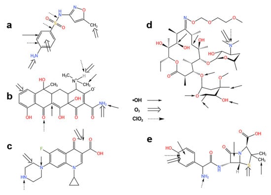 However, many other oxidants are selective and only react with some of groups in the antibiotic molecular. The findings of various studies [124,125,126,127,128,129,130,131,132,133,134] on the attack sites of O3, ∙OH, and ClO2 against sulfamethoxazole, tetracycline, ciprofloxacin, roxithromycin, and amoxicillin are shown in Figure 7.
