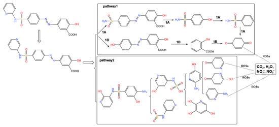 Ostman et al. found removal rates of over 90% for ciprofloxacin, erythromycin, metronidazole, and trimethoprim using ozonation in a sewage treatment plant [135]. It was reported that the combination of ultraviolet (UV) and peroxydisulfate degraded sulfonamides more efficiently than the combination of UV and H2O2, with a removal rate of close to 99% [136]. Through studying UV/H2O2/O3, Lester et al. showed that the concentration of H2O2 was an important parameter in the two sub-processes of UV/H2O2 and H2O2/O3 and can fully mineralize ciprofloxacin and trimethoprim [137]. Two major reaction pathways for oxidative degradation of sulfasalazine by O3/H2O2 system [138] are displayed in Figure 8. OH first attacks the azo group (pathway 1) followed by the sulfonamide group (pathway 2), resulting in the rupture of N=N and N-S bonds, respectively (only some of the intermediates are shown in the figure). Lastly, the ROSs react further with these intermediates to produce end products, such as carbon dioxide, water, and inorganic ions [139]. The oxidative degradation of sulfasalazine clearly manifests that intermediates produced in the reaction are out of control and, as the toxic effects of these intermediates are unknown, this problem should be taken seriously. For example, while 73% of cefradine was degraded within 0.237 h by UV treatment, the toxicity of its byproducts was 1.04 times greater than that of the parent compound [140].