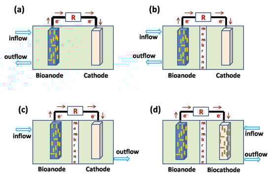 Different processes for antibiotics removal in MFCs: (a) single-chamber MFC, (b) dual-chamber MFC, (c) sequential anode-cathode operation in a dual-chamber MFC, and (d) biocathode operation in a dual-chamber MFC according to Zakaria and Dhar [143].