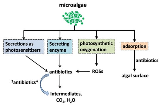 The mechanisms through which microalgae remove antibiotics can be summarized as follows and shown in Figure 10. First, the algal surface can strongly adsorb organic pollutants which can then be removed by photolysis [80,169,170]. Second, algae secrete enzymes that can accelerate the catalytic degradation of organic pollutants [169,170]. Third, algae increase the content of dissolved oxygen in water through photosynthetic oxygenation, increasing the ROS levels and thus promoting photolytic degradation of organic pollutants [169,170]. Fourth, algae and their secretions may act as photosensitizers to induce the indirect photolysis of organic pollutants [171]. However, studies on the removal of organic pollutants by microalgae are relatively limited and thus the predominant removal mechanism is unknown.