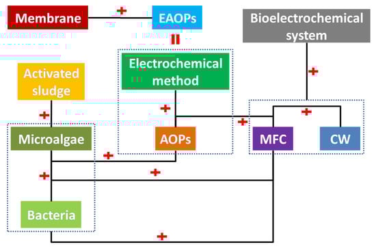 Hybrid techniques have been developed for antibiotic removal. As shown in Figure 11, combinations between the use of microalgae, AOPs, CWs, MFC, activated sludge, membrane, and electrochemical methods have been investigated.