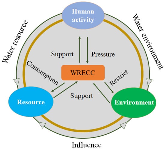 Early researchers mainly focused on the limitation effect of water resources and did not consider the differences in economy, environment, and policy between different subjects. For example, Feng et al. (2008) [] defined the environmental water carrying capacity as the largest population able to be supported by available water resources in a certain region. Research on the water resource carrying capacity has been combined with the sustainable development theory to evaluate water resource status, emphasizing that water resources should achieve natural circulation and renewal without deterioration. Although scholars define the WRECC differently, there is a general agreement that the WRECC reflects the relationship between human activities and the status of water resources and the environment (Wang et al. 2018; Liao et al. 2020) [,].