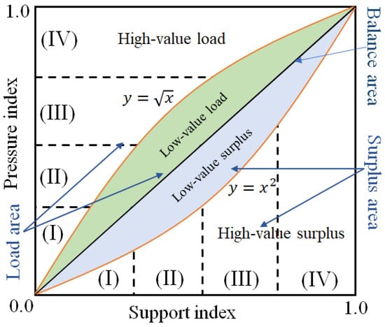 To accurately describe the surplus-load state of the WRECC, we referred to an evaluation standard for a traditional interaction mechanism (Zhang et al. 2003) [], and further divided WRECC into four levels: low, medium, high, and advanced. Figure 2 shows the corresponding I-IV states. When the load-surplus category is greater, the WRECC indicator is at a high level, indicating that this region has a stronger development ability. Furthermore, to clearly describe the relative strength of the support and pressure indexes, we adopted the standard strategy of the partition by using straight line , and curves and , as shown in Figure 2 and Table 2. Here, the relationship between the support and pressure indicator is similar to the previous results for socio-economy and environmental protection (Zhang et al. 2003) [].