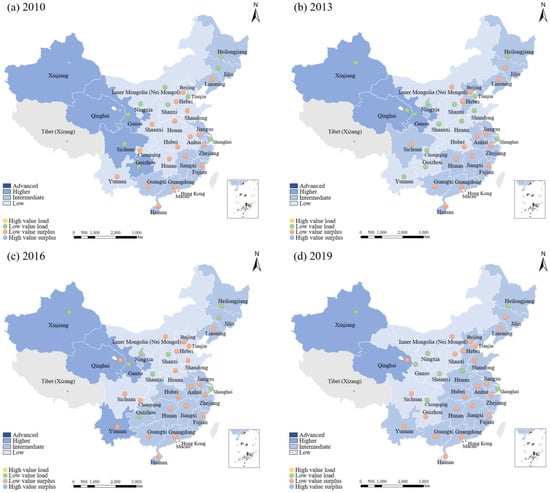 Figure 3 shows the WRECC indicator map of China’s provinces in 2010, 2013, 2016, and 2019. The results show that areas with a high-level of WRECC in 2010 are mainly from western China, including Xinjiang, Qinghai, Gansu, Sichuan, and Guizhou (see Figure 3a). However, the states of the WRECC indicator of these provinces significantly differ. Xinjiang and Qinghai have both large R, reflecting a surplus. In contrast, Gansu, Sichuan, and Guizhou are areas with low R value, reflecting a larger pressure on the WRECC. Xinjiang has the largest support (0.943) and pressure (0.758) indexes among all provinces. Its WRECC indicator reaches 1.244, which represents an R > 1. The support and pressure indicators of Gansu are 0.733 and 0.867, demonstrating they are relatively high. However, its WRECC indicator is only 0.845 which represents an overload state, with R < 1.