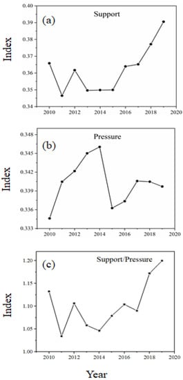 Variation plot of indicators for support, pressure, and WRECC. Here, (a) represents support index, (b) represents pressure index, while (c) represents the ratio of support for pressure.