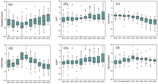 (ii) The impact of GDP on the WRECC was mostly positively correlated but increased with the development of the economic level and scale (see Figure 5b). At the beginning of the research period (2010–2013), the GDP gradually changed from a negative to a positive effect on the WRECC. Additionally, with the advancement of socioeconomic growth and economic development mode, the proposal of water-saving and wastewater emission reduction targets limits the wastewater emissions induced by socioeconomic activities. This leads to a positive effect between GDP and WRECC. On the other hand, the boxplot becomes longer and longer over time, suggesting the effect of GDP coefficients is increasingly discrete in that study period.