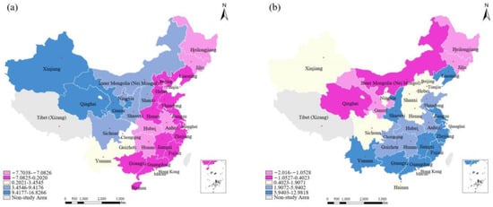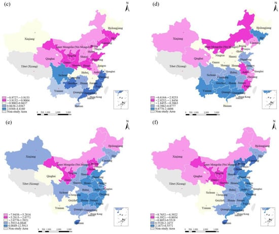 The influence and spillover effect of the coefficient of UR on the WRECC increases from north to south, with a changing trend along a gradient. The regression coefficient falls between −6.6164 and 2.4406 (see Figure 6d). Due to different historical and geographical conditions, the UR in northern China is underdeveloped in comparison with the southern area. Additionally, the degree of marketization is low in this area, leading to a relatively small consumption of water resources in production processes.
