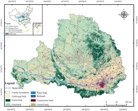 The Weihe River Basin is the first sub-basin of the Yellow River Basin, in northwestern China (104°00′–110°20′ E, 33°50′–37°18′ N), with a basin area of about 1.34 × 105 km2. It contains 13 cities in Shaanxi, Gansu, and Ningxia provinces (Figure 1). The Weihe River Basin has a continental monsoon climate zone, which is a transition zone between arid and humid areas. The precipitation in the basin decreases from southeast to northwest due to the topography. There is abundant precipitation in the south at the foot of the Qinling Mountains, with a maximum annual precipitation of 1000 mm. The precipitation decreases as the elevation of the terrain decreases, with an average annual precipitation of about 500 mm in the plain areas. The average annual temperature is 7.8–13.5 °C. The topography of the Weihe River Basin is high in the west and low in the east. The highest elevation in the west is 3495 m. From west to east, the terrain gradually becomes gentler and the valley becomes wider. The main mountain ranges are Liupanshan, Longshan, Ziwuling, and Huanglong Mountain in the north, Qinling Mountains in the south, and Taibai Mountain, the highest peak, with an altitude of 3767 m. The watershed is rich in vegetation types, mainly including coniferous forests, broad-leaved forests, scrub, grassland, grasses, and cultivated plants. The natural conditions in the basin vary significantly, and the topography is complex. The upper and middle reaches of the Wei River are the loess hill area, which is fragmented and complex, with many ravines and loose soils. This area is highly susceptible to erosion. The northern part of the middle and lower reaches of the Wei River is the Loess Plateau in northern Shaanxi, which is the area in China, and even in the world, which is the most susceptible to soil erosion. The central part of the middle and lower reaches of the Wei River is a plain area with flat terrain and an advantageous location. The southern part includes the Qinling Mountains, with high vegetation cover and good ecological conditions. The Weihe River Basin is an important part of the hydrological system in the middle and upper reaches of the Yellow River in China, and it plays an irreplaceable role in the supply of water resources and maintaining the balance of water and sediment. Under the new situation, with the development of the Guantian Economic Belt in the basin and the establishment of the Guanzhong urban agglomeration, it has brought opportunities for the economic and social development of the Weihe River Basin, and also raised challenges for the ecological protection of the basin. Therefore, scientific assessment of the eco-environment quality of the Weihe River Basin and its impact mechanism has important strategic significance for the high-quality development of the basin.