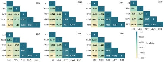 In order to further test the comprehensive representativeness of the RSEI, in this study, the correlation coefficients between the five indicators (RSEI, WET, NDVI, NDSI, and LST) during the study period were calculated, and the average correlation model was used to test the applicabilities of the RSEI indicators. The closer the average correlation result is to 1, the stronger the comprehensive representation of the index [1], which is expressed as follows: