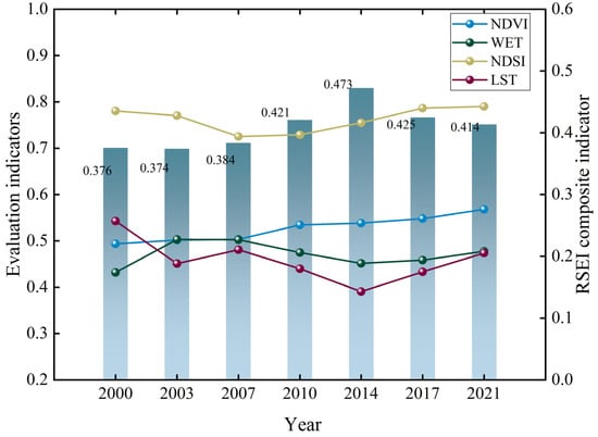 The RSEI was used in this study to monitor the ecological changes in the Weihe River Basin during 2000–2021. The four indicators of greenness (normalized difference vegetation index, NDVI), wetness (WET), dryness (normalized difference building soil index, NDSI), and heat (land surface temperature, LST) all affect human life; so, it is credible to use the coupled comprehensive index (RSEI) to reflect the changes in the quality of the eco-environment [63].