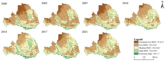 As can be seen from Table 3, the contribution rates of the first principal component eigenvalues of the four indicators were above 60% during the study period, indicating that the first principal component maximized the concentration of the characteristics of the four indicators, namely, greenness, wetness, dryness, and heat, and the contribution rates of each indicator only had the same positive and negative distributions in the first principal component. Specifically, the NDVI, which represents vegetation cover, and Wet, which represents the wetness of the eco-environment, both had positive values in the first principal component, while the LST, which represents the surface temperature, and the NDSI, which represents the degree of hardening of the land used for construction and bare soil, both had negative values. This indicates that NDVI and Wet promote the improvement of the eco-environment quality, while the LST and NDSI inhibit the improvement of the eco-environment quality, which is consistent with the realistic influences of the four indicators on the eco-environment. Therefore, it is feasible to select the results of the first principal component for use in the RSEI calculation.