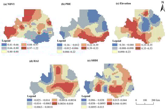 Vegetation cover is the basis for the formation of ecosystem services in the basin. Vegetation restoration is conducive to improving the supply of regional ecosystem services, which is of great significance to the overall improvement of the quality of the regional eco-environment [74]. The Loess Plateau in the northern region has a fragile eco-environment, and large-scale vegetation restoration should be strengthened to reduce regional soil erosion. In the landscape pattern index, the spatial impact of SHDI on RSEI varies greatly, and the overall performance is that the regional correlation coefficient of population agglomeration is positive, and gradually presents a negative correlation to the northwest region. In areas with intensive human activities, a reasonable landscape pattern layout can further improve the regional eco-environment quality. Overall, the drivers selected in this study explained most of the variation in RSEI (Table 6 and Table 7), and the strength and nature of the correlation coefficients of each influencing factor varied significantly in terms of spatial variation (Figure 6). Therefore, for the Weihe River basin with a low regional economic level and fragile eco-environment quality, regional management should promote the sustainable development of national vegetation construction, improve the diversity of species in the basin, pay attention to the optimization of landscape pattern, and improve the resistance and resilience of the ecosystem. At the same time, future ecosystem management, planning, and decision making should focus on maintaining a balance between human activities and vegetation restoration.