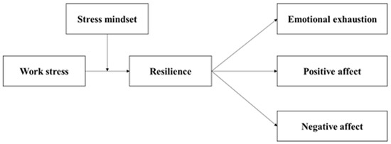 Although work stress may bring negative consequences to individual resilience and emotional well-being, it may also be affected by individuals’ implicit beliefs about stress, which is called stress mindset [5]. Specifically, Crum et al. (2013) [5] defined two different stress mindsets: one mindset that stress can promote performance and productivity, improve health and happiness, and help with learning and growth is called the stress-is-enhancing mindset; the other one that states that stress will reduce performance and productivity, damage health and happiness, and hinder learning and growth is called the stress-is-debilitating mindset. A stress mindset affects individuals’ stress perception, stress response, and coping style, so it is closely related to individual emotional outcomes [5,18,19]. Compared with individuals with the stress-is-debilitating mindset, individuals with the stress-is-enhancing mindset will generally experience more subjective well-being and less stress, anxiety, and depression [18,20,21]. A stress mindset could regulate the cognitive and emotional results of stress events, in which the stress-is-enhancing mindset could be used as a protective factor to reduce the adverse effects of stress itself. Moreover, the stress mindset will also affect the individuals’ resilience. Those salesmen who hold the stress-is-enhancing mindset had stronger resilience [22]. The stress-is-enhancing mindset enables individuals to construct the positive meaning of perceived work stress. Therefore, even if work stress is high for individuals, it will not damage their resilience when they have a stress-is-enhancing mindset, which in turn maintains their positive affect and protects individuals from emotional exhaustion and negative affect. Therefore, this study proposes Hypothesis 3: College teachers’ stress mindset moderates the mediating effect of resilience between work stress and emotional outcomes (emotional exhaustion, positive affect, and negative affect).