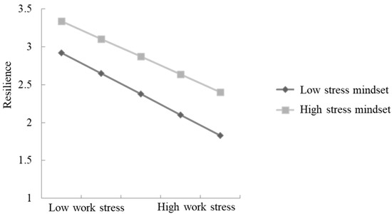 In order to explain the interaction effect of work stress and stress mindset more clearly, a simple slope analysis was carried out (see Figure 2). It is found that when stress mindset was low, work stress had a significant negative predictive effect on resilience (βsimple = −0.54, p < 0.001); when stress mindset was high, work stress could still negatively predict resilience (βsimple = −0.47, p < 0.001), but its effect decreased. It showed that a stress mindset negatively moderated the path between work stress and resilience.