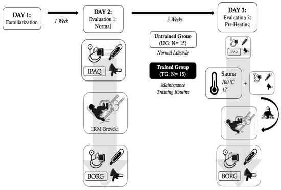 The study protocol was performed on three different days. On the first day, every participant visited the laboratory and the fitness room at the Sport Sciences School in order to get acquainted with the equipment and facilities. On the second day, body composition and anthropometric characteristics, body temperature, blood pressure and heart rate, as well as indirect maximal strength were evaluated for each participant. Finally, on the third day, the same evaluations as on the second day were performed again but including a sauna bath session immediately before the strength test. All the testing procedures and techniques are described in the following sections. The entire study design is represented in Figure 1.