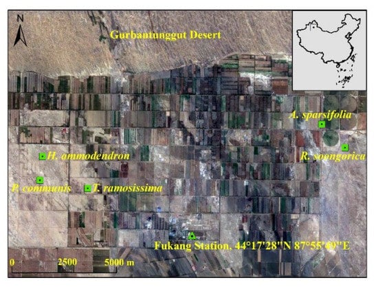The present research was conducted at the Fukang Station of Desert Ecology, Xinjiang Institute of Ecology and Geography, Chinese Academy of Sciences (43°45′–45°29′ N 87°43′–88°44′ E), at the southern edge of the Junggar Basin (Figure 1). The region has a typical temperate continental arid climate, with a mean annual rainfall of 160 mm and a mean annual temperature of 6.6 °C. The natural vegetation is dominated by Reaumuria soongorica (Pall.) Maxim, Haloxylon ammodendron (C. A. Meyer) Bunge, Tamarix ramosissima Ledeb, Alhagi sparsifolia Shap, and Phragmites communis (Cav.) Trin. ex Steud. The soil type is gray desert salt-alkali soil and dry sandy loam soil. Five plant communities were selected for analysis, based on the dominant natural vegetation. Three randomly selected 25 × 25 m experimental plots were established in each of the five communities, resulting in a total of 15 plots (Table 1).
