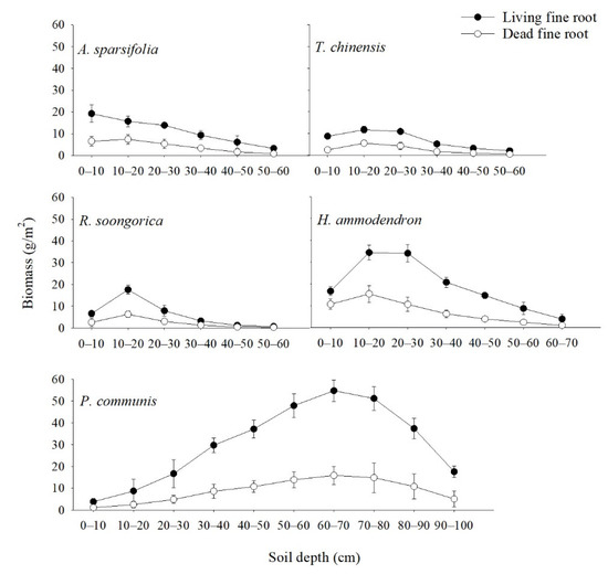 The vertical distribution of living fine root biomass first increased and then decreased with soil depth in the five communities. However, in the A. sparsifolia community, it only decreased with soil depth. Living fine root biomass was highest in the 10–20 cm soil profile, except for the A. sparsifolia and P. communis communities (Figure 2). The highest living fine root biomass at 10–20 cm was 11.78–34.41 g/m2 for the T. ramosissima, R. soongorica, and H. ammodendron communities, whereas the highest living fine root biomass at 0–10 cm and 60–70 cm was 19.25 and 54.79 g/m2 for A. sparsifolia and P. communis, respectively. The fine root biomass was mainly concentrated at a depth of 0–30 cm. The living fine root biomass at a depth of 0–30 cm accounted for 63.86–86.0% of the total living fine root biomass for the A. sparsifolia, T. ramosissima, R. soongorica, and H. ammodendron communities, but living fine root biomass at 40–90 cm accounted for 84.65% of the total living fine root biomass for the P. communis community.