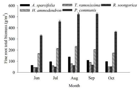 Fine root biomass showed strong seasonal dynamics in the five communities from June to October (Figure 4). The highest fine root biomass was found for the P. communis community and the lowest was for the R. soongorica community. The monthly mean fine root biomass was 54.19–438.89 g/m2 for the five communities. The seasonal variation in biomass was similar between the A. sparsifolia and H. ammodendron communities, with an initial increase followed by a decrease; the highest values of 138.31 and 229.73 g/m2, respectively, were measured in August. The seasonal variation in biomass was similar among the T. ramosissima, R. soongorica, and P. communis communities; biomass first increased and then decreased, with the highest values of 66.29–523.41 g/m2 being measured in September.