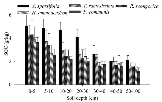 The β values of the SOC ranged from 0.9472 to 0.9570 for the five communities (Figure 6). Among all communities, the accumulation of SOC with soil depth differed significantly (Figure 5). The mean SOC value was only 74.36% for the H. ammodendron, T. ramosissima, R. soongorica, and P. communis communities at 0–30 cm, whereas for the A. sparsifolia community, 80.36% of the SOC was distributed in the 0–30 cm soil layer.