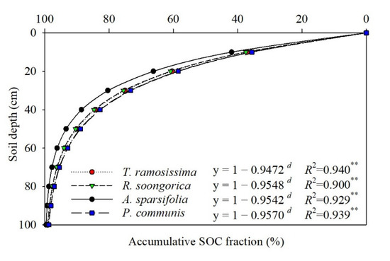 Asymptotic single−parameter global model of the vertical distribution of soil organic carbon (SOC) of the five plant communities in 0–100 cm. Note: d, soil depth (cm); Significance levels: **, p < 0.01.