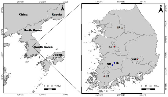Sampling sites of the chironomid larvae from the rivers (SC—Sunchang and IS—Imsil, marked in blue dot) and weirs (IP—Ipo, SJ—Sejong, JS—Juksan, and GG—Gangjeong, marked in red triangle) in South Korea.