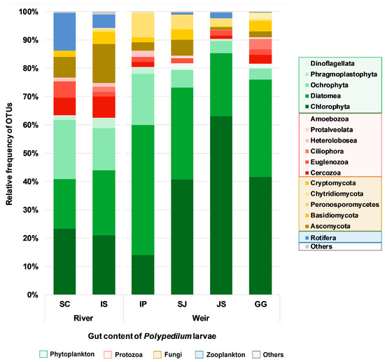 The gut content of Polypedilum larvae (Chironomidae) in the river and weir habitats was demonstrated using OTU analysis. OTUs were assigned by calculating the 0.03 cut-off distance. Total eukaryotic OTUs detected were 4066 in SC, 6361 in IS among river chironomid and it was found to be 2004 OTUs in IP, 2031 in SJ, 2014 in JS, and GG with 1372 OTUs, respectively. Taxonomic classification using the SILVA reference database revealed the composition of the food content. As such, 24 phyla (class (54), order (89), family (105), genus (140)) from river chironomid and 25 phyla (class (62), order (104), family (125), genus (188)) from weir chironomid gut contents were identified. Altogether, we grouped 29 phyla into phytoplankton, protozoa, fungi, zooplankton, and a few minor OTU taxa as others.