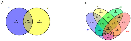 Venn diagram of shared and unique OTUs in the gut profile of river and weir midges. OTUs were clustered using a threshold distance of 0.03. (A). Further, 17 common taxa in IS and SC were Arthropoda, Ascomycota, Basidiomycota, Cercozoa, Chlorophyta, Ciliophora, Diatomea, Dinoflagellata, Euglenozoa, Heterolobosea, Nematozoa, Nucleariidae/Fonticula, Ochrophyta, Peronosporomycetes, Phragmoplastophyta, Rotifera and Vertebrata. 6 unique food sources of IS midges were Annelida, Chytridiomycota, Cryptophyta, Marine Stramenophiles, Mollusca, and Haptophyta and a rare group in SC is Cryptomycota. (B). 12 common food content in IP, SJ, JS, and GG were Ascomycota, Basidiomycota, Cercozoa, Chlorophyta, Chytridiomycota, Cryptomycota, Diatomea, Euglenozoa, Ochrophyta, Peronosporomycetes, Phragmoplastophyta, and Vertebrata. OTUs of Arthropoda were shared between IP, SJ, and JS. Rotifera was the shared food item in SJ, JS, and GG. Protalveolata was a common taxon in SJ and GG, Halobacterota in IP and JS, Ciliophora, Cnidaria, and Nucleariidae/Fonticula were the common diet components in JS and GG. Heterolobosea (IP), Annelida (SJ), Euryarchaeota, and Amoebozoa (JS) were the unique food items shown.