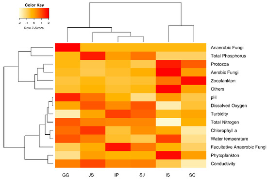 The food contents were grouped as phytoplankton, protozoa, fungi (aerobic, anaerobic, and facultative anaerobic), zooplankton, and others (minor/rare OTUs). Two cluster analyses showed the correlation pattern of environmental conditions with the specific food source equivalently clustered in the habitats, shown in the dendrogram. The dominant group of phytoplankton showed an association with conductivity. To this, an equivalent correlated cluster of facultative anaerobic fungal groups was found associated with pH, DO, turbidity, total nitrogen, chlorophyll-a, and water temperature. A second cluster pattern indicated a correlation of protozoa, aerobic and anaerobic fungi, zooplanktons, and all minor OTUs (others) with total phosphorus.